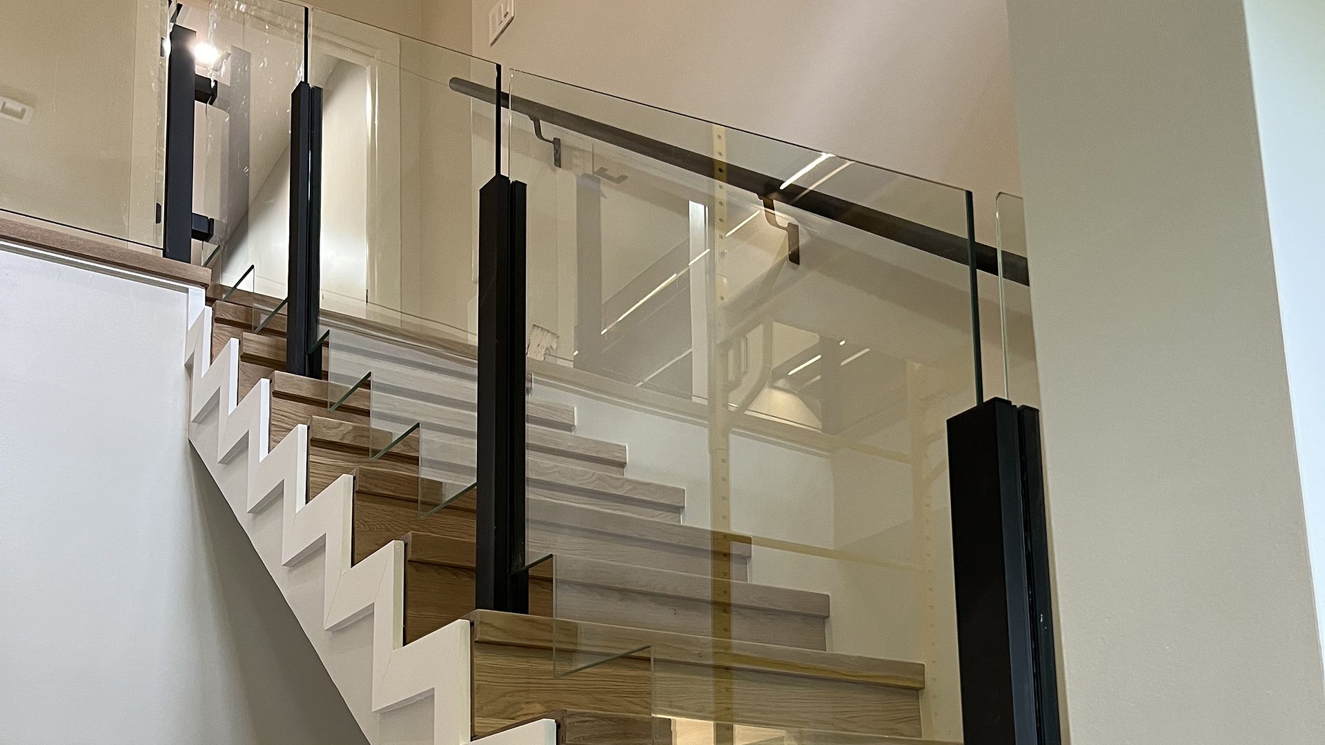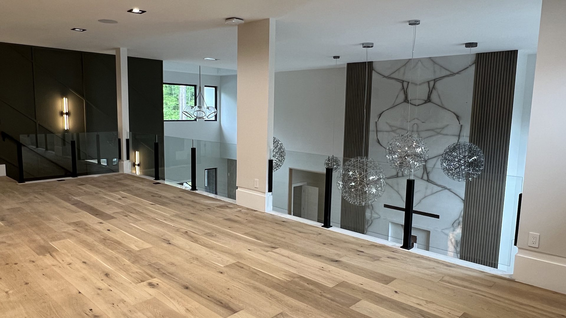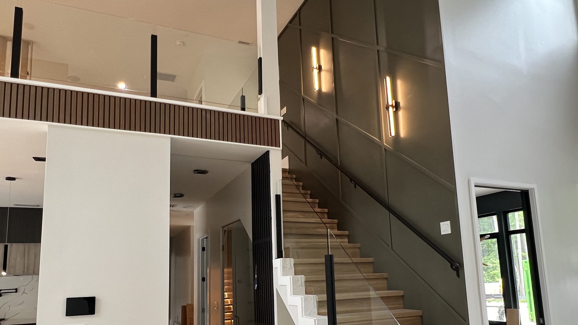 This celebrity home outside Atlanta epitomizes luxury and innovation with its stunning interior railing system. Featuring the “The Standard” System, this project integrates wall-mounted posts and stair-stepped glass panels that create a dramatic, eye-catching effect throughout the home. The railings are perfectly tailored to complement the sleek, modern design of the interior, with 36″ tall glass providing both safety and an unobstructed view of the expansive space. Notably, this project also includes Falcon Railings’ first-ever two-story glass railing, which adds a touch of architectural brilliance to the home’s custom-designed closet. Every detail, from the high-quality materials to the expert craftsmanship, reflects the homeowner’s commitment to style and sophistication.