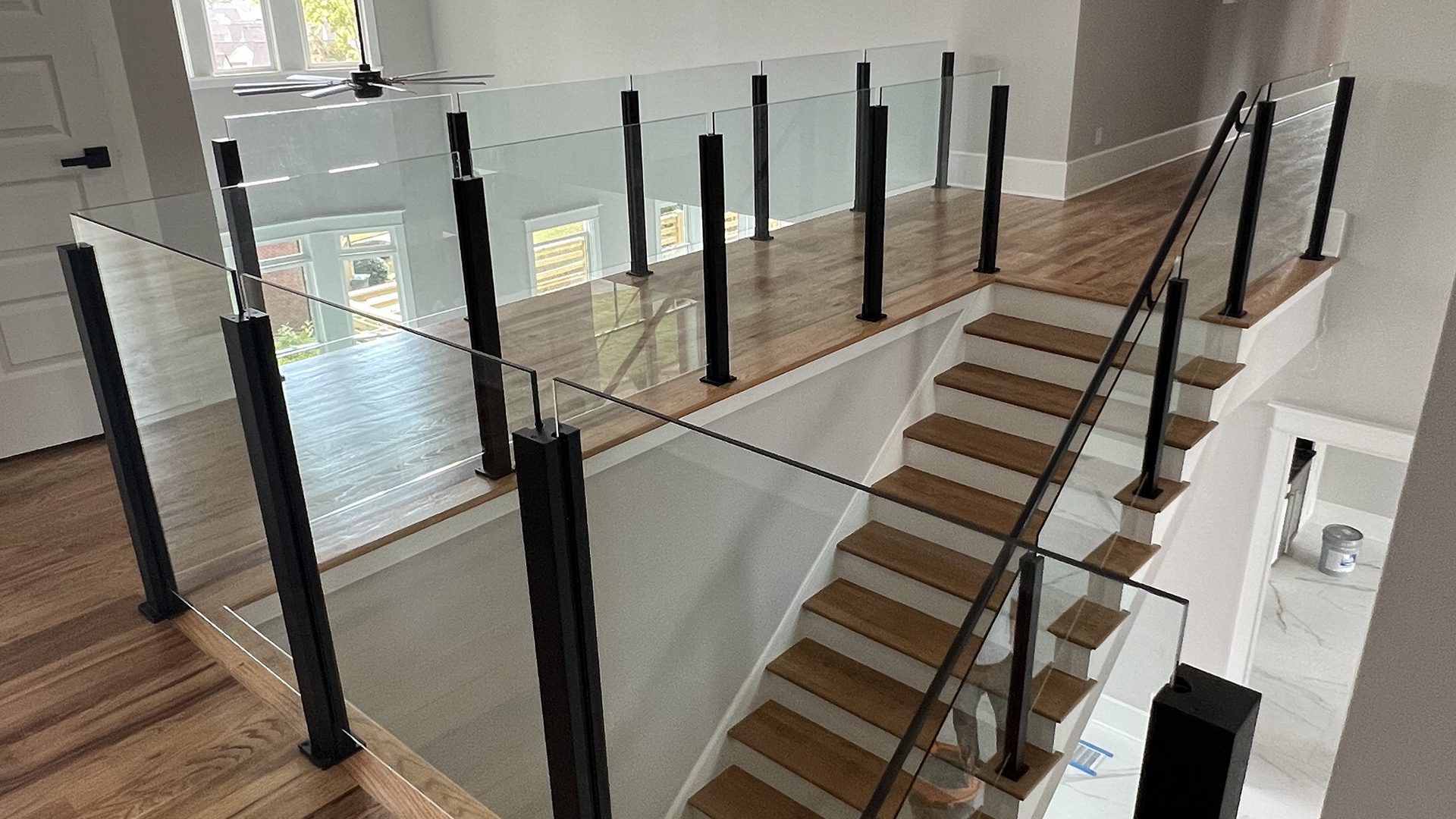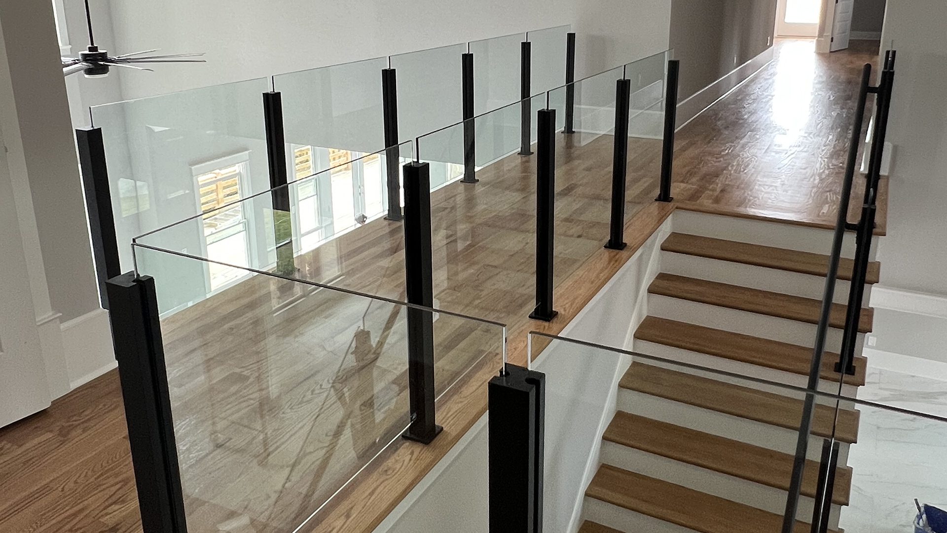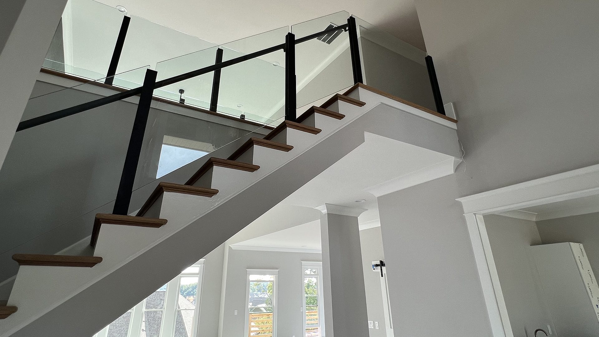 In this stunning new construction in Marietta, Georgia, the “The Standard” System takes center stage, enhancing the modern interior with its clean lines and high-end finishes. The 39” overall height of the railings ensures maximum safety without compromising the open, airy feel of the space. The precision-crafted glass panels provide clear sightlines across the home. Installed along both the stairs and the overlook, this system seamlessly integrates into the architecture, becoming a focal point that ties together the home’s contemporary design. It’s a perfect example of how Falcon Railings combines functionality and style to elevate any project.